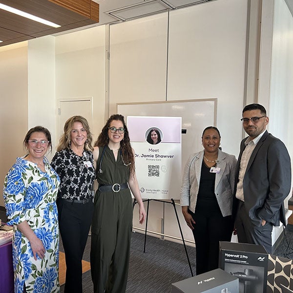 (L to R) Jaime S. Foster, PhD, RD; Patty O'Keefe; Jamie Shawver, DO; Carolyn Alessi; and Jacob Diogostine represented Trinity Health Of New England at the JAX colleague wellness event.