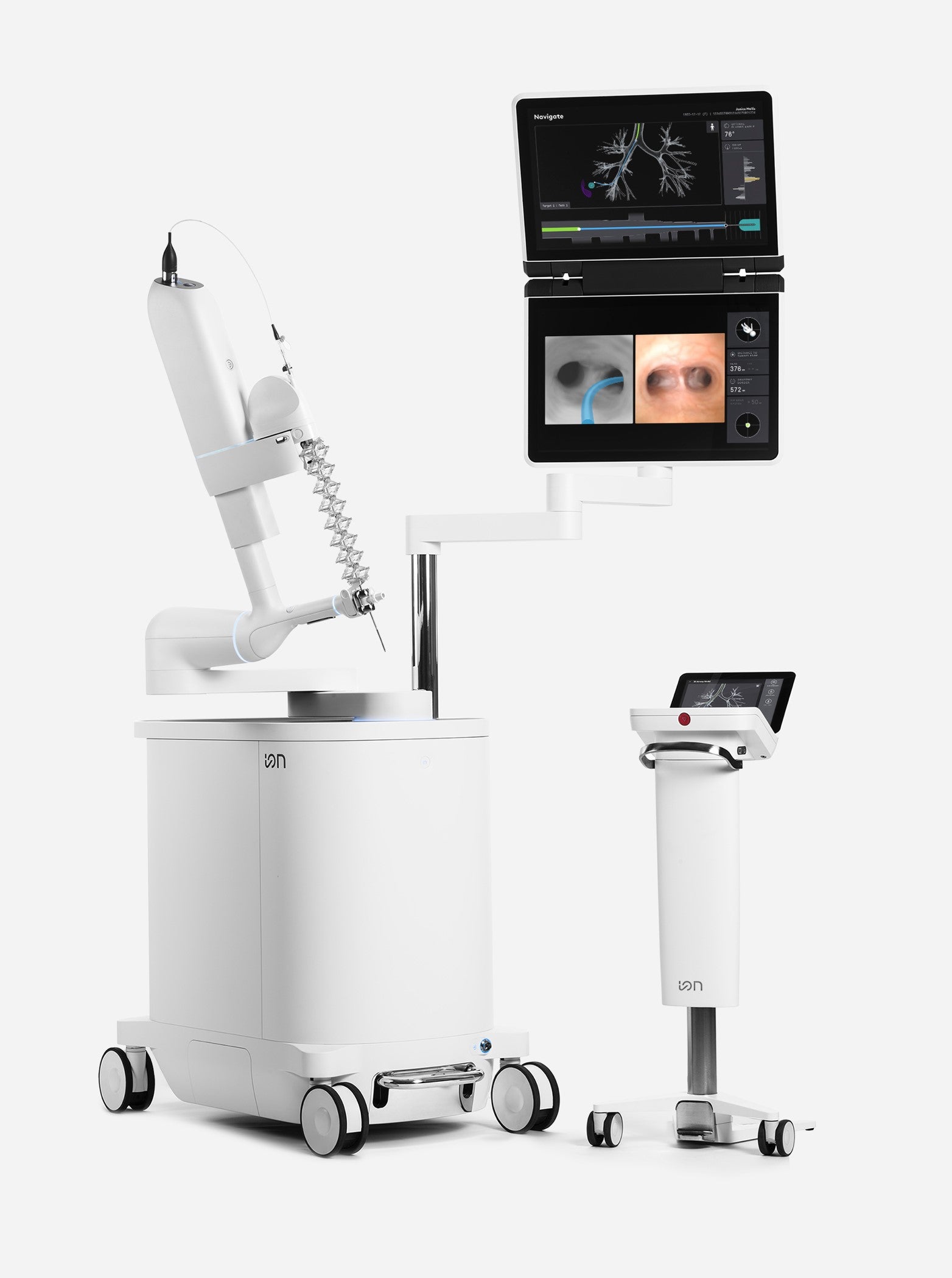 How Ion benefits patients:Prior to Ion, one common method to biopsy peripheral lung lesions was to use a live CT scan imaging and a needle, entering the chest wall and lung from outside the body. However, this method of biopsy is associated with significant risk of collapsing the lung, which can require hospitalization for some patients. Bronchoscopy with Ion robotic platform allows the specialist to use natural openings in the body, like the mouth, and substantially decreases risk of collapsing the lung. Compared to previous navigational bronchoscopy platforms, the flexibility and shape-sensing capabilities of the Ion catheter increase diagnostic capabilities, enabling a more precise biopsy. When used with lung cancer screening, Ion supports early diagnosis and staging of the lung cancer, often with just one minimally invasive procedure. Ion benefits: