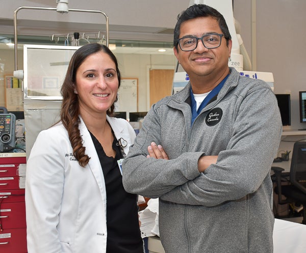 Pioneer Valley Cardiology Associates’ Alise Bartolucci, MSN, FNP-C, CCK, AACC, Advanced Practice Provider Team Lead and Lead Nurse Practitioner, CardioMEMS Program, and Mashrafi Ahmed, MD, FACP, in the Cardiac Cath Lab at Mercy Medical Center.