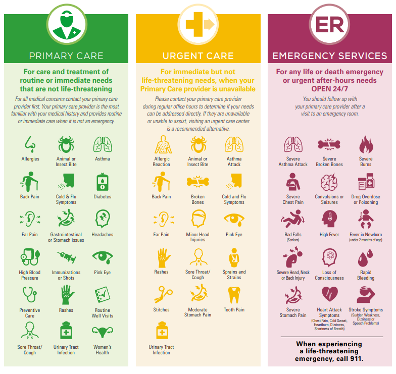 EMERGENCY CARE is meant for serious medical conditions where delaying care could cause permanent harm or even death. If you or a family member encounters a situation as such, you should seek immediate care at and ER or by calling 911.