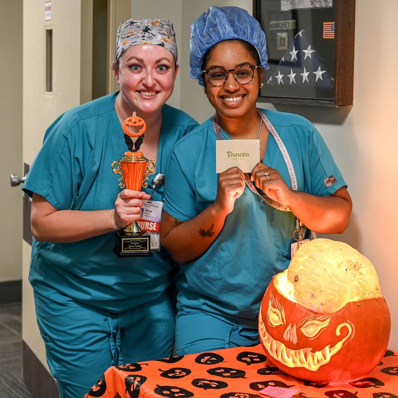 Colleagues from the Saint Francis Hospital Department of Surgery, including nurses, physicians, physician assistants, surgical techs, and other staff put their pumpkin carving skills to the test by competing in the department’s first Pumpkin Carving Contest. Alicia Cahill, RN, and Laishaa Sepulveda, Certified Surgical Tech, were the winners of the inaugural contest with their submission “Did Someone say STAT Crainy?” Second and third place winners were team efforts by surgical PAs.