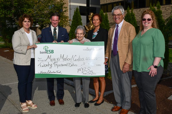 Present for the check presentation were Susanne deVillier, Vice President and Regional Branch Manager, bankESB; Geoffrey Hoyt, Chief Development Officer, Mercy Medical Center; Sister Mary Caritas, SP; Susan Pettorini-D’Amico, Chief Nursing Officer, Mercy Medical Center; Philip Glynn, MD, Director of Medical Oncology, Sister Caritas Cancer Center; and Katherine Sordillo, Vice President and Regional Branch Manager, bankESB.