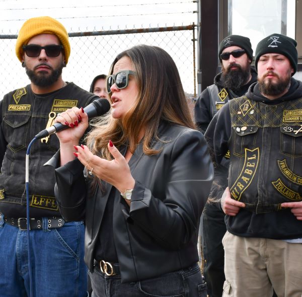 Edna Rodríguez, LP-PsyD, Regional Director of Behavioral Health, Trinity Health Of New England, thanks motorcyclists for their participation in the annual Brightside Toy Run as members of the Longriders MC look on.