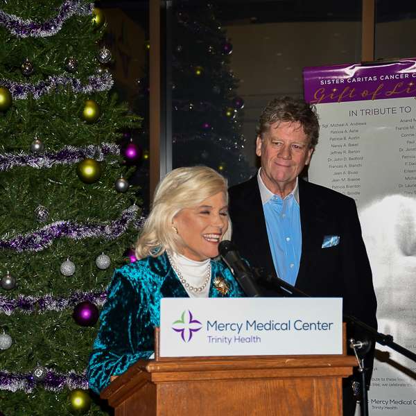 In advance of the tree lighting, the event included remarks by Robert Roose, MD, MPH, President of Mercy Medical Center, Johnson Memorial Hospital, and Saint Mary’s Hospital; Philip Glynn, MD, Medical Director of the Sister Caritas Cancer Center; and John Sjoberg and Brenda Garton-Sjoberg, Mercy supporters and longtime Gift of Light participants. Sister Mary Caritas, SP, also led the group in prayer. Immediately after flipping the switch to light up the tree, the gathering broke out into a festive version of Deck the Halls.