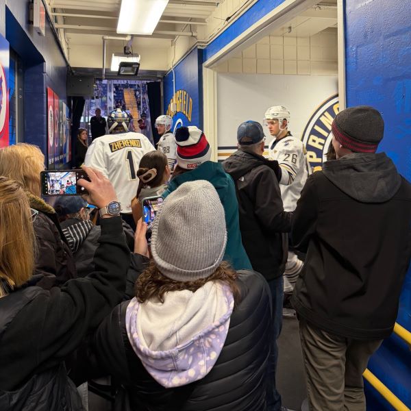 Stroke survivors and their families in the High Five Tunnel before the Thunderbirds game.