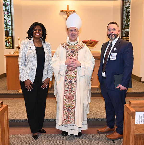 (L to R) Valerie Powell-Stafford, President, Saint Francis; Bishop Juan Miguel Betancourt, Hartford Archdiocese; and Mike Rogers, Mission Leader, following Bishop Betancourt's mass in honor of Saint Francis de Sales.