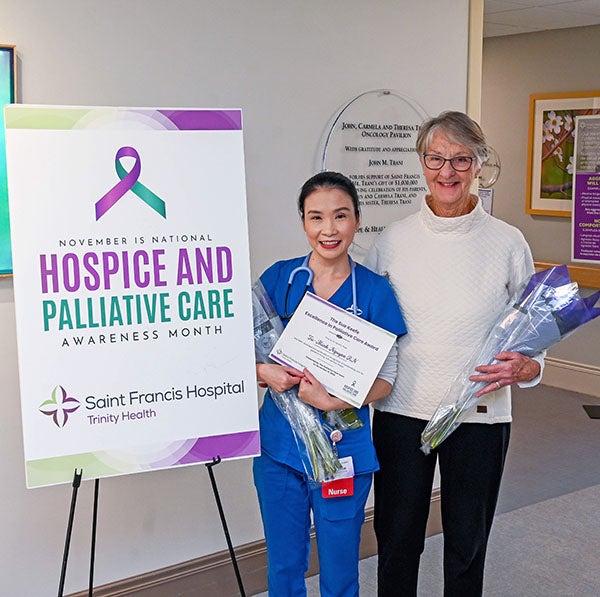 Tu-Minh Nguyen, RN (left) is the 2025 Sue Keefe Excellence in Palliative Care Award recipient. The award is named in honor of Sue (right), who created the Palliative Care Team at Saint Francis.