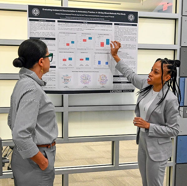 Veronica Maria Pimentel, MD, MS, FACOG, Maternal-Fetal Medicine Specialist and Director of Research for OB/GYN Residency at Saint Francis, who delivered the keynote address, hears from one of the almost 300 authors represented at 2025 Research Day.