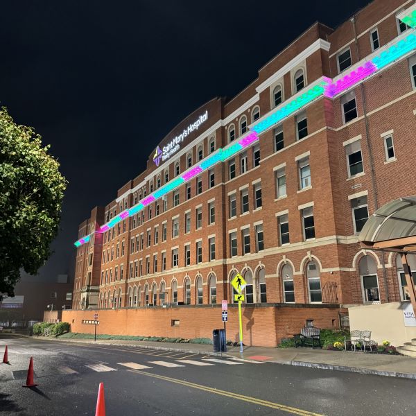 On October 13, Saint Mary's Hospital joined over 270 landmarks worldwide to #LightUpMBC in teal, green, and pink, honoring lives lost to metastatic breast cancer and shining hope for those still fighting. The campaign raised over $484,000 for the non-profit METAvivor Research and Support Inc. These funds directly support metastatic breast cancer research.